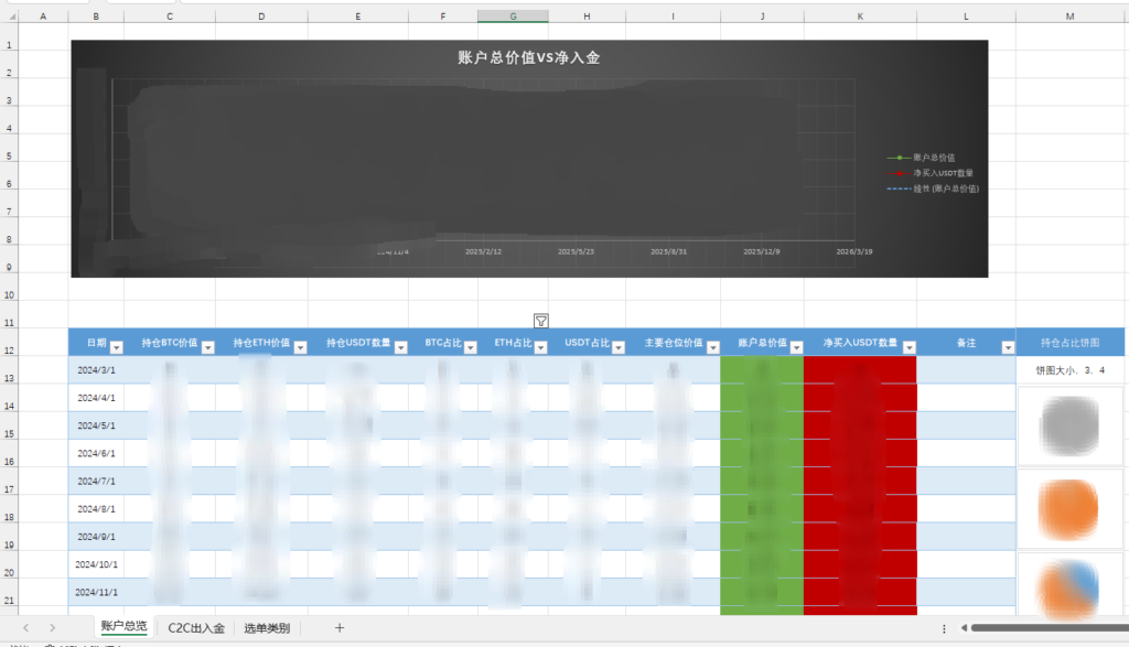 还新建了一个账户总览表格,对账户里的总资金状况做记录,做到心中有数。主要包含两个sheet,第一个是每个标的价值、账户总价值、净入金在每月初的快照,以及各标的占比的饼图,便于检验仓位是否健康,也画了账户总价值VS净入金曲线图,看看自己的战绩如何?;第二个是出入金记录,用于记录转入转出的资金。