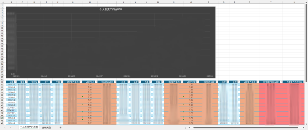 以上只是记录某个账户/软件里的,因此另外又创建了一个个人资产终极汇总表,把诸如微信、支付宝、各银行卡与投资理财软件等所有账户汇总起来的表格。里面包含CNY、HKD、USD三种,通过STOCK数据自动换汇加总,就形成了个人拥有的所有现金与资产的总价值。我没有什么值钱的实物资产,也就免去了加入实物资产价值的烦恼(竟然被我说成好事了??)。